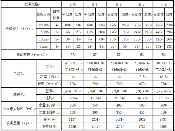 K型往復(fù)式給煤機(jī)由機(jī)架、底板(給煤槽)、傳動(dòng)平臺(tái)、漏斗、閘門(mén)、托輥等組成。當(dāng)電機(jī)開(kāi)動(dòng)后經(jīng)彈性聯(lián)軸器、減速機(jī)、曲柄連桿機(jī)構(gòu)拖動(dòng)傾料5°的底板在輥上作直線(xiàn)往復(fù)運(yùn)動(dòng),煤均勻地卸到其他設(shè)備上。