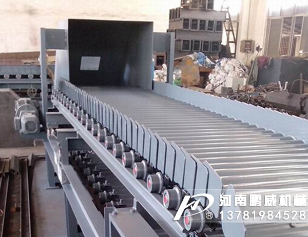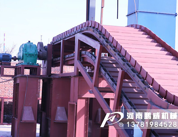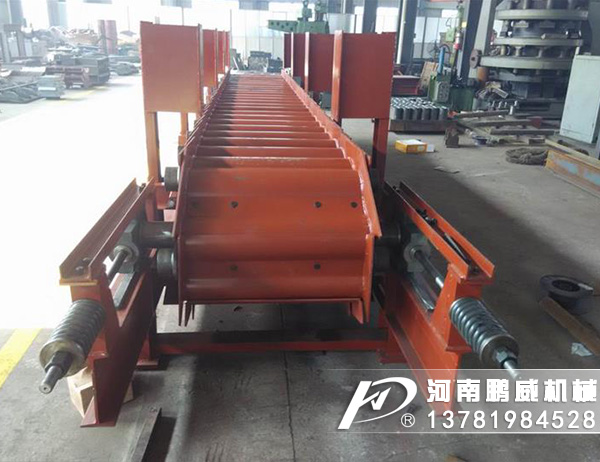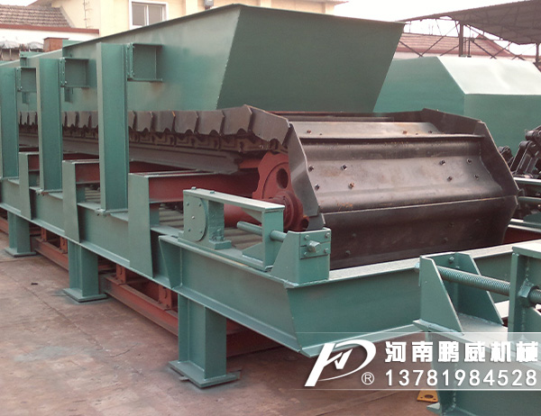 重型板式給料機(jī)是將電動(dòng)機(jī)的動(dòng)力,經(jīng)過(guò)聯(lián)軸器和減速器驅(qū)動(dòng)鏈輪軸旋轉(zhuǎn),通過(guò)鏈輪齒與鏈條銷(xiāo)軸嚙合,拖動(dòng)鏈板作連續(xù)直線運(yùn)動(dòng),鏈板由安裝在機(jī)架上的支重輪和鏈輪支承,并通過(guò)調(diào)整拉緊裝置使其鏈條與鏈輪正確嚙合,完成輸送給料之目的。