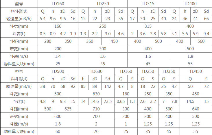 TD型斗式提升機(jī)是膠帶提升機(jī),本公司產(chǎn)品根據(jù)斗子寬度可分四個(gè)型號(hào):TD160、TD250、TD350、TD450,可采用深斗淺斗滿(mǎn)足不同的生產(chǎn)需求,最大能輸送69.6m3/h物料,提升高度為4-30m。傳動(dòng)裝置TD型斗提升機(jī)的傳動(dòng)裝置有兩種形式分別配有YZ型減速器ZQ(或YY)型減速器。YZ型軸減速器直接裝在主軸軸頭上,省去了傳動(dòng)平臺(tái)、聯(lián)軸器等,使結(jié)構(gòu)緊湊、重量輕,而且其內(nèi)部帶有異型輥逆止器,逆止可靠。該減速器噪音低,運(yùn)轉(zhuǎn)平穩(wěn),并隨主軸浮動(dòng),可消除安裝應(yīng)力。TD型斗式提升機(jī)的牽引件為橡膠帶,料斗以一定的間隔固定在橡膠帶上,橡膠帶分別繞過(guò)提升機(jī)頭部和底部的滾筒,構(gòu)成具有上升有載分支和下降無(wú)載分支的閉合環(huán)形系統(tǒng);工作時(shí),布置在提升機(jī)頭部的驅(qū)動(dòng)裝置通過(guò)頭部滾筒將動(dòng)力傳給橡膠帶和料斗,物料從提升機(jī)底部的進(jìn)料口進(jìn)入料斗,料斗將物料提升至頭部的卸料口,在離心力和重力的共同作用下,料斗中的物料經(jīng)卸料口卸出。